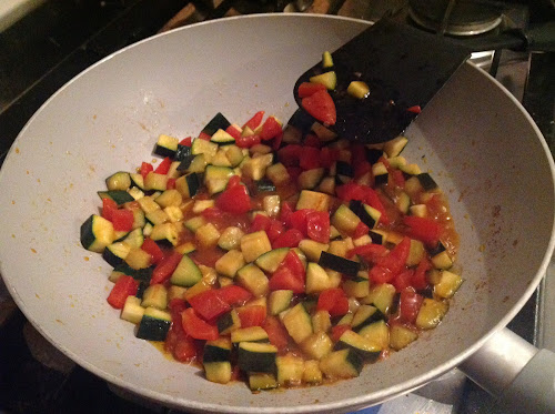 - Tagliate a cubetti le zucchine e i pomodorini, e metteteli in una pentola antiaderente con un Cuore di Brodo al Manzo e dell'olio Dante Condisano. Fateli cuocere a fuoco medio.
